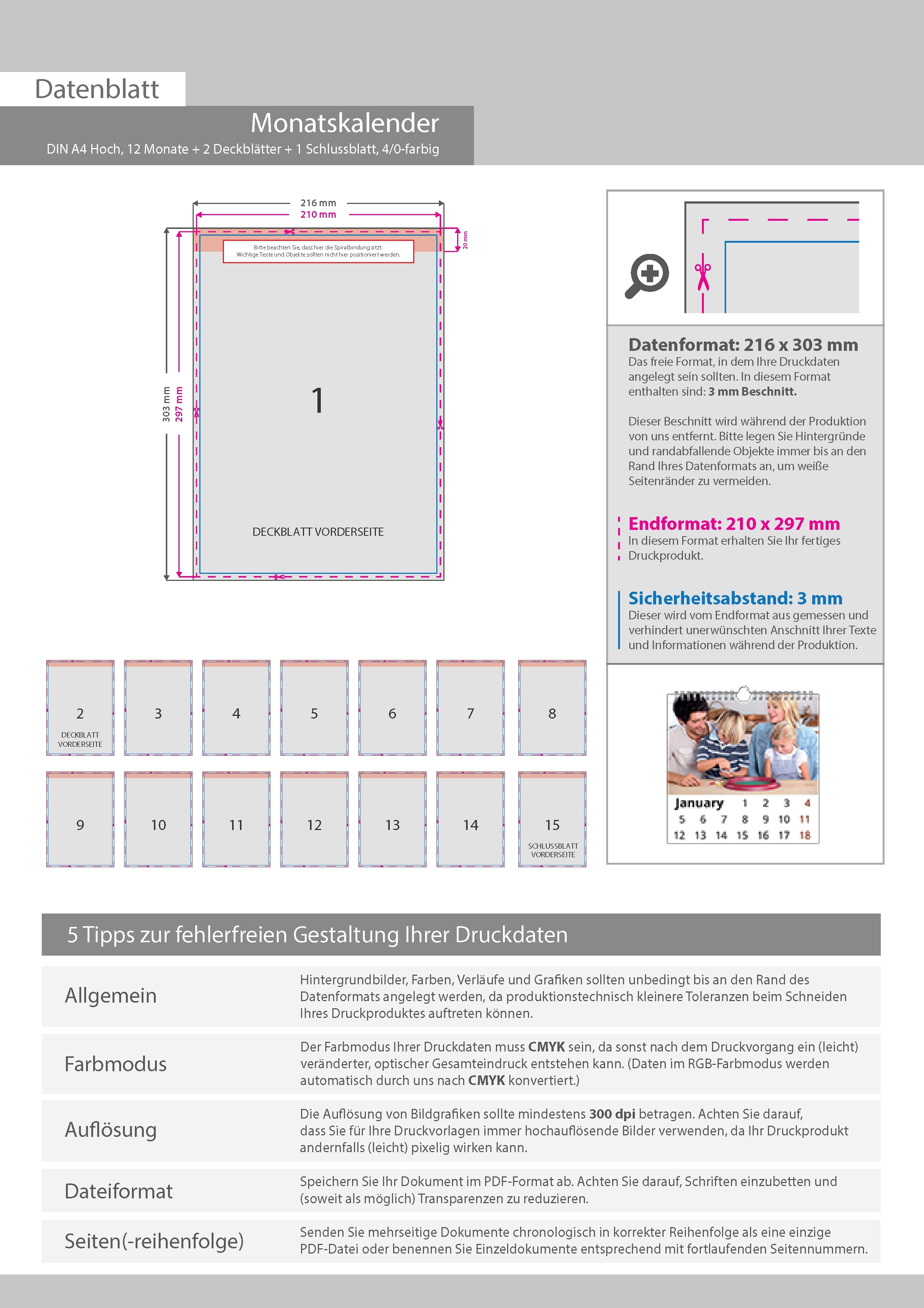 Monatskalender 15 Blatt (12 Monate + 2 Deckblätter + 1 Schlussblatt)