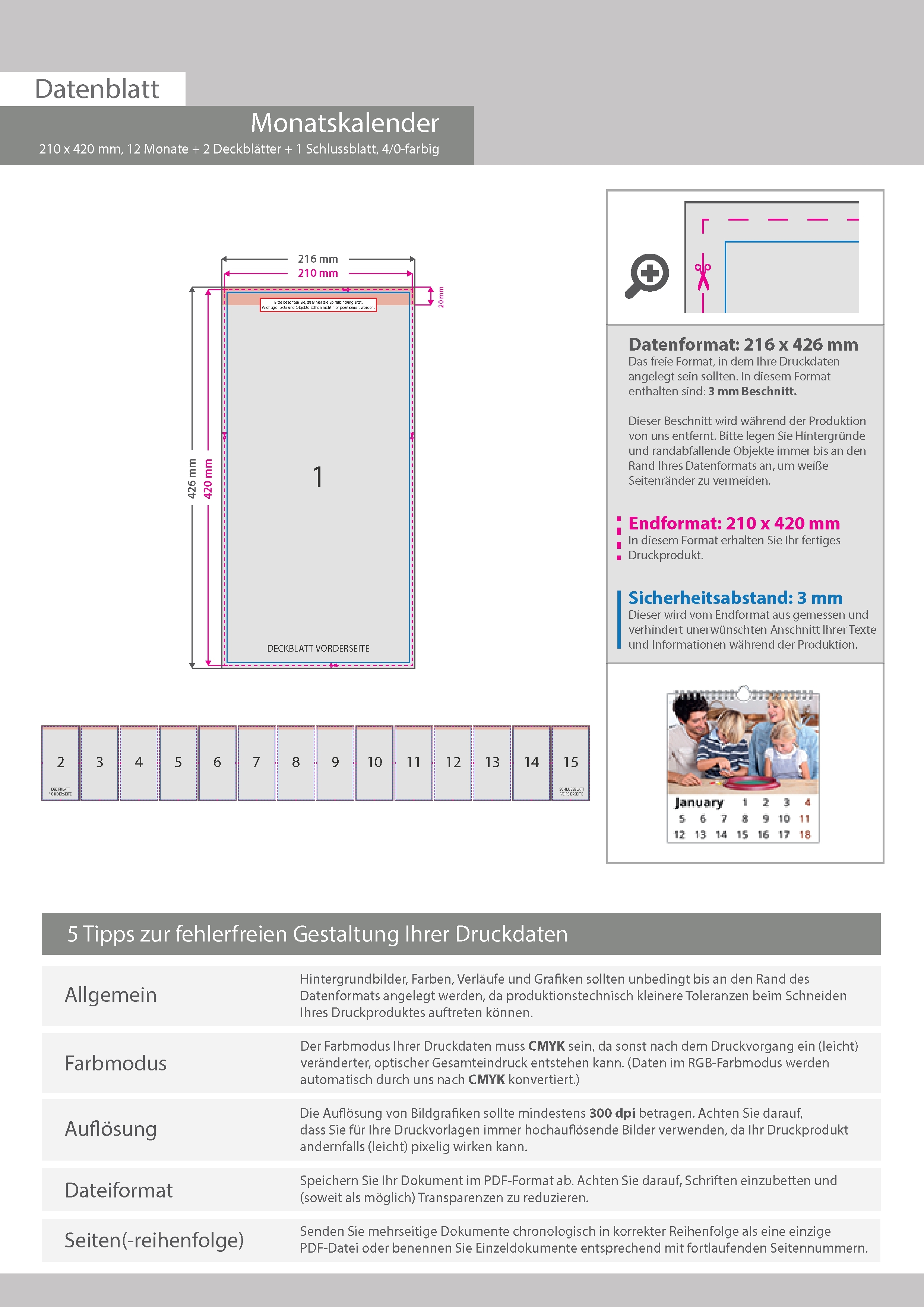 Monatskalender 15 Blatt (12 Monate + 2 Deckblätter + 1 Schlussblatt)