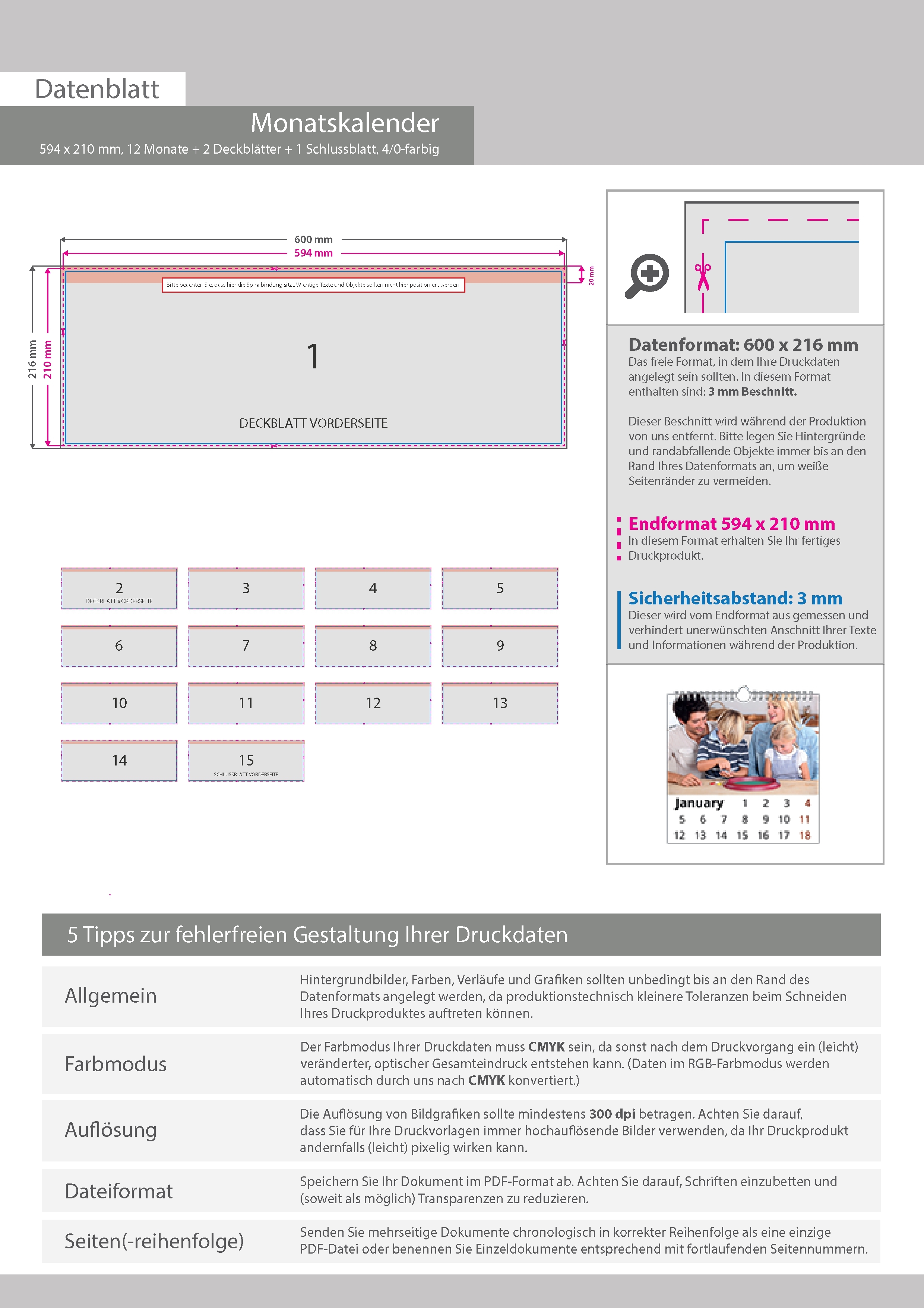 Monatskalender 15 Blatt (12 Monate + 2 Deckblätter + 1 Schlussblatt)